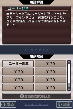 |新品:¥2,980~ 中古:¥380~- 実践的なビジネスの知識やノウハウを自然に学べる「ビズ体験DSシリーズ」。今作では飲食業界をテーマに、ライバル店を凌駕するストーリーを通じてビジネス知識を学ぶことができる。前作よりも向上したゲーム性に加え、ビジネスの戦略やノウハウなどの図解を使った説明画面、難しい用語をその場で確認できる「用語解説画面」、反復学習ができる「確認テスト画面」など、便利な機能が奥深いストーリーの中にちりばめられている。